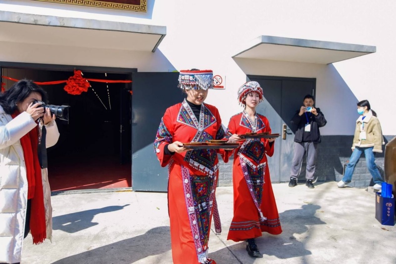 正式參觀前特別設(shè)置了攔門酒環(huán)節(jié),穿著民族服飾的廠區(qū)工作人員在樓前喊著歌、遞著酒,引得嘉賓們一陣叫好,掌聲不斷。